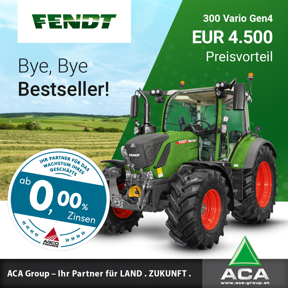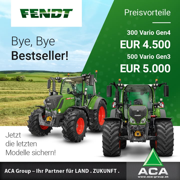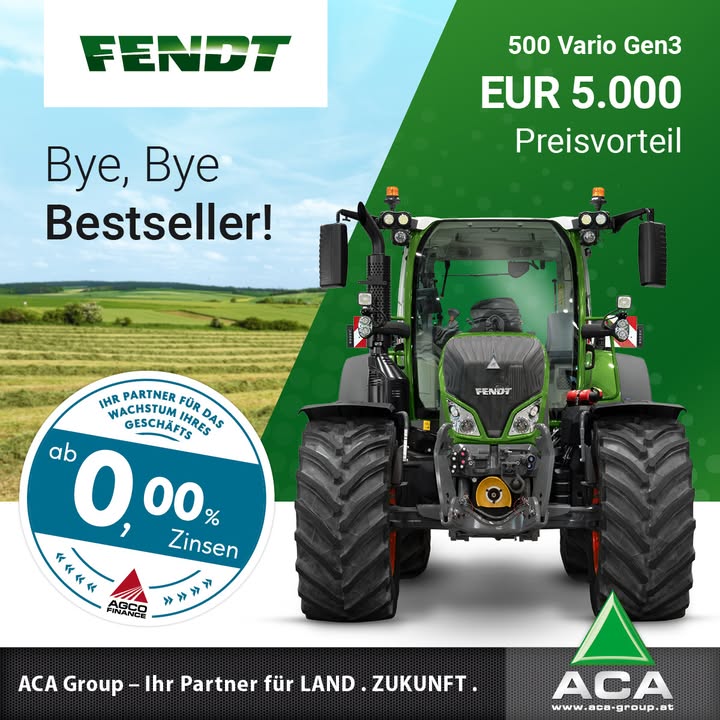 🚜💸 Bye, Bye Bestseller, wir verabschieden uns von dem Fendt 500 Vario Gen3. Jetzt sind die letzten Modelle zum Sonderpreis erhältlich. Schlagen Sie zu und und sichern Sie sich ganze 5.000 Euro Preisvorteil auf den effizienten und zuverlässigen Bestseller.